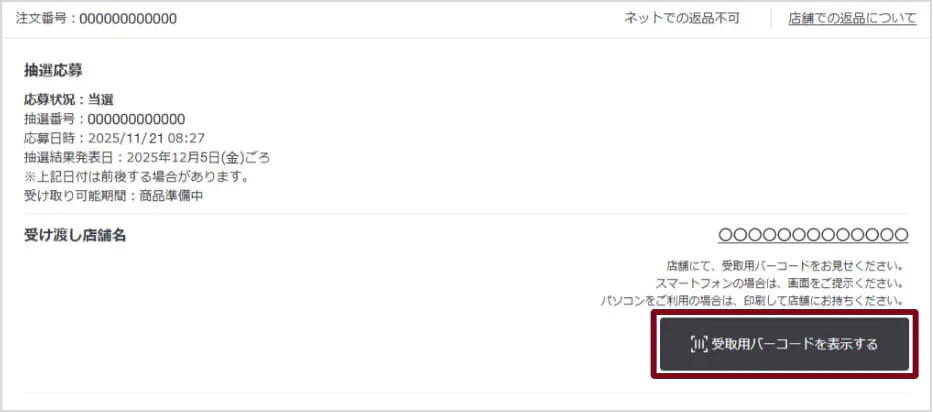 抽選結果の確認はメールか注文履歴ページで確認ができます。