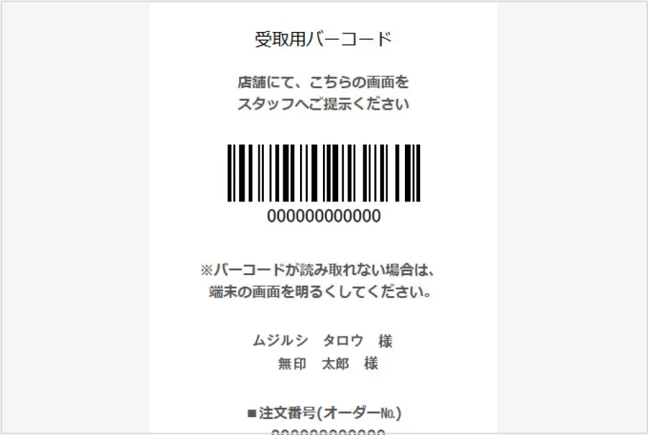 出典:無印良品 「受取用バーコードを表示する」ボタンを押すと、注文番号(オーダーNo,)の受取用バーコードが表示されます。
